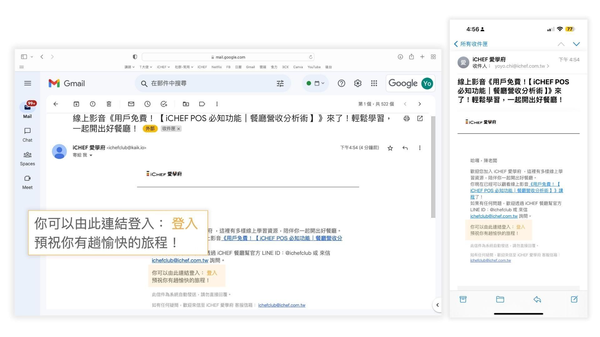 圖 1-4:已註冊過【 iCHEF 愛學府 】,所收到的通知信件