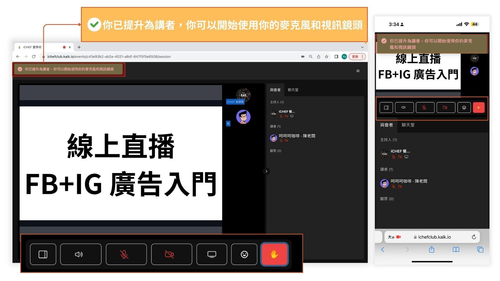 當你看到上方綠框「 你已提升為講者,你可以開始使用你的麥克風和視訊鏡頭」的說明時代表你可以開起麥克風,口頭發問了!如圖 2-7。