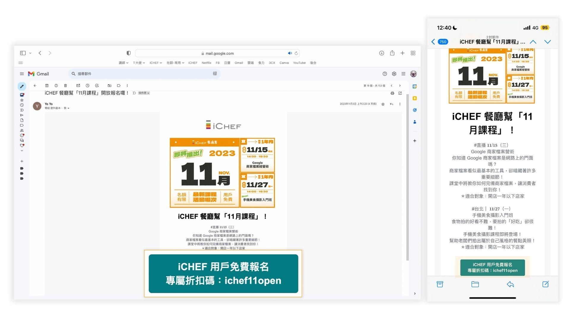 圖 1-1:每個月底 iCHEF 餐廳幫會寄送課程活動資訊及折扣碼至你登記在 iCHEF 的信箱