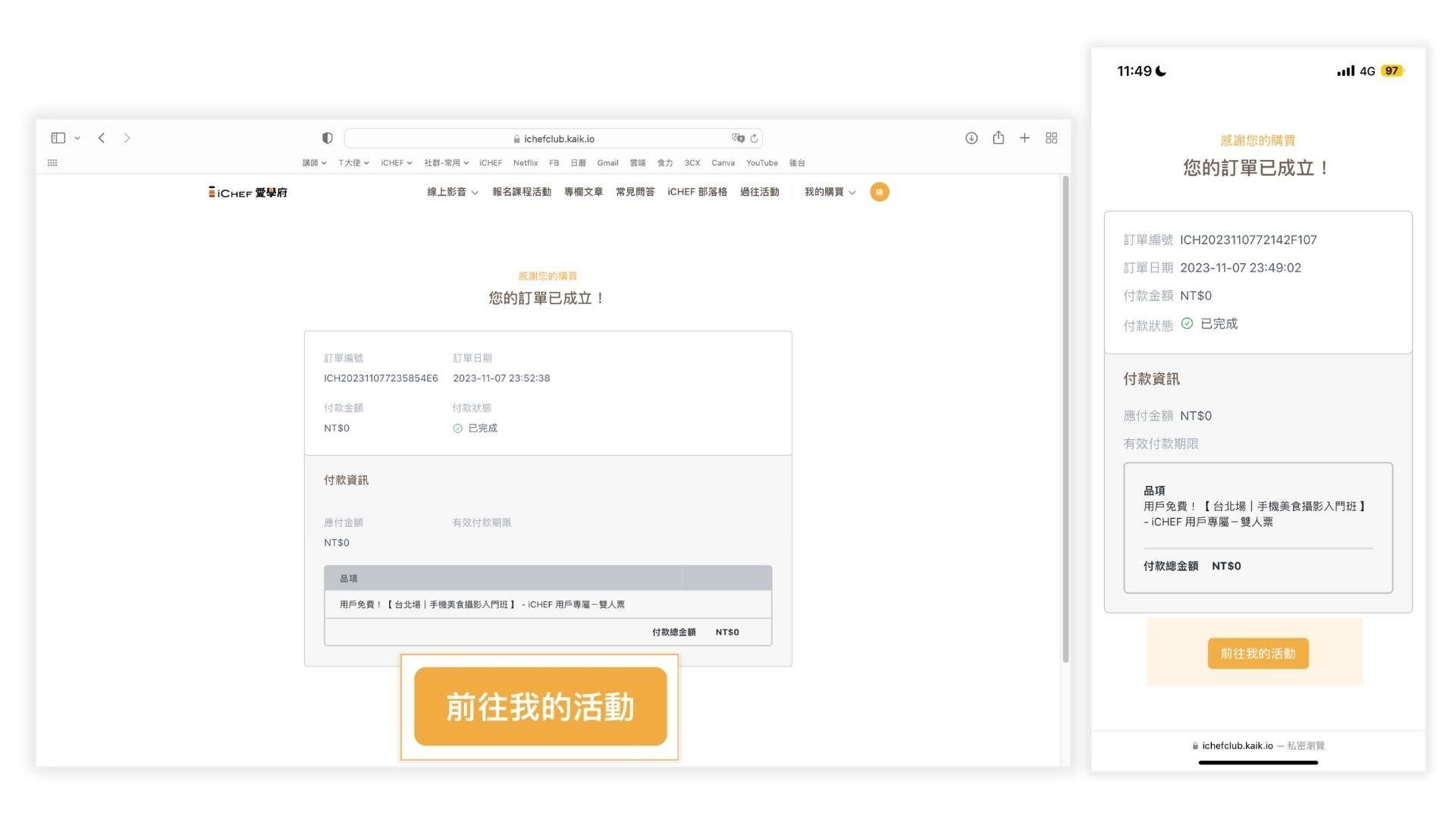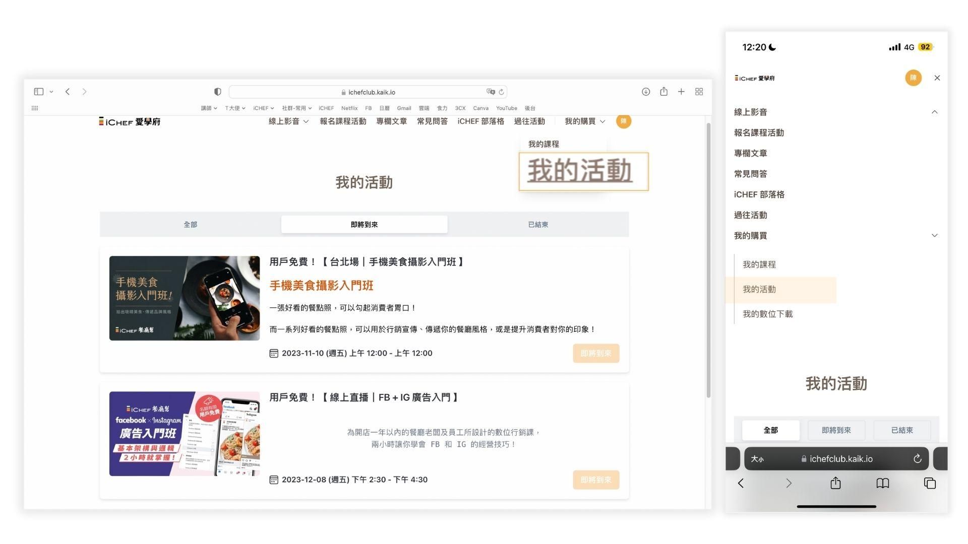 圖 3-10:透過右上角「 我的購買 」➡️「 我的活動 」查看你報名的所有課程活動