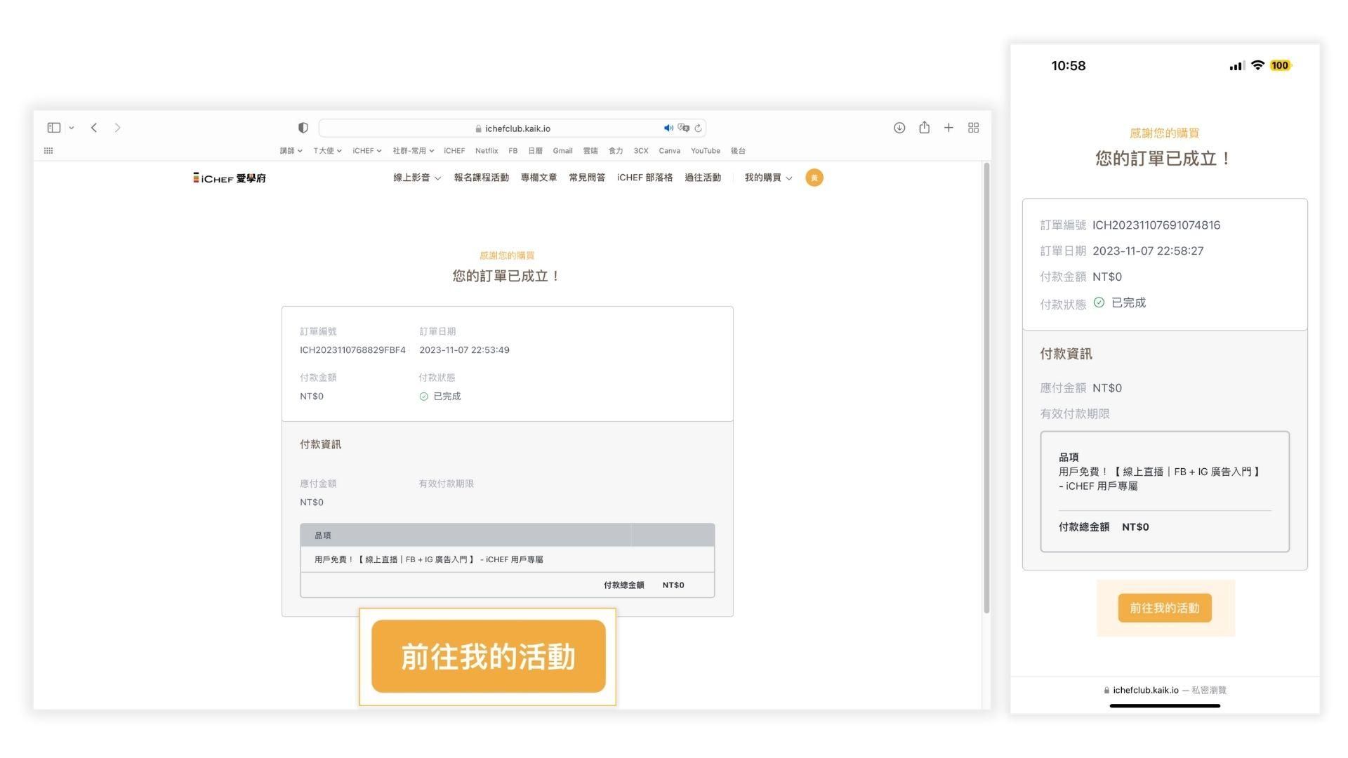 最後,若想查看其他報名的課程活動請點擊圖 3-8 中的「 前往我的活動 」,或透過右上角「 我的購買 」點選「 我的活動 」(手機請點擊右上角三條線符號),查看你報名的課程活動如圖 3-10。