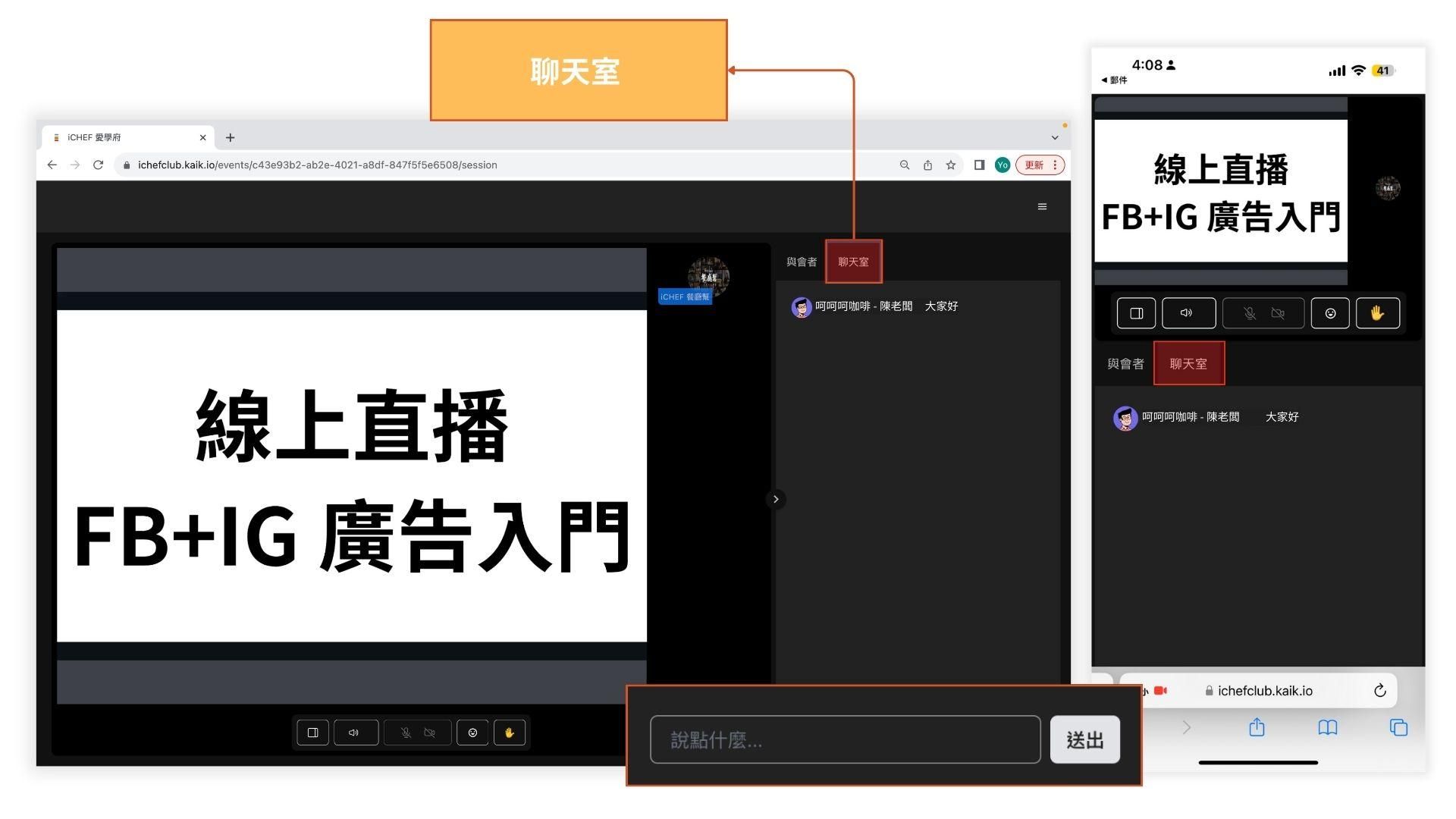 我們還有聊天室可以留言如圖 2-9,主持人會代你向講者發問~