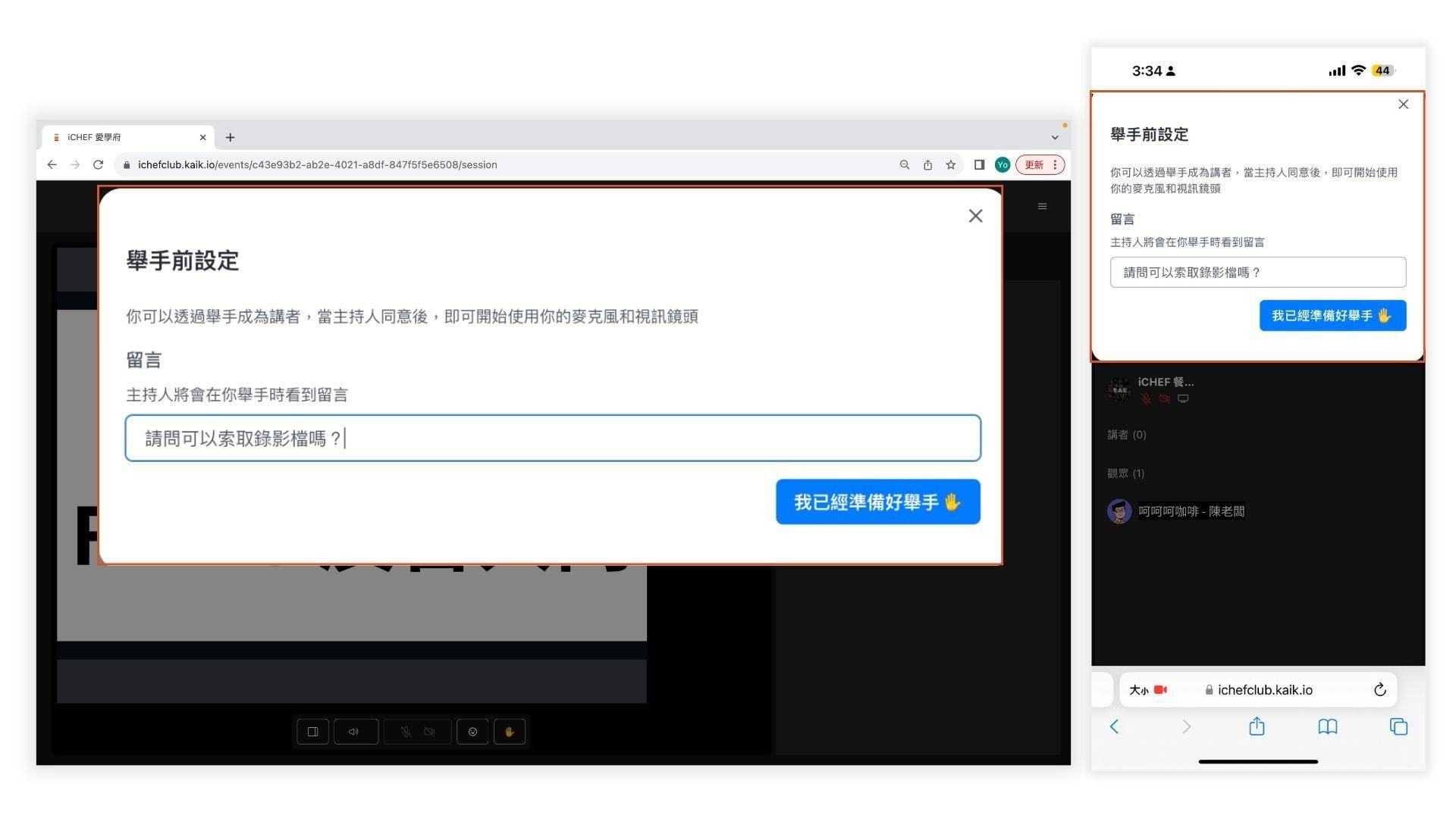 發問結束後,我們會幫你關閉麥克風,這時你會看到橘框「 你已變回觀眾」的說明,以及麥克風和鏡頭功能已關閉,如圖 2-8。