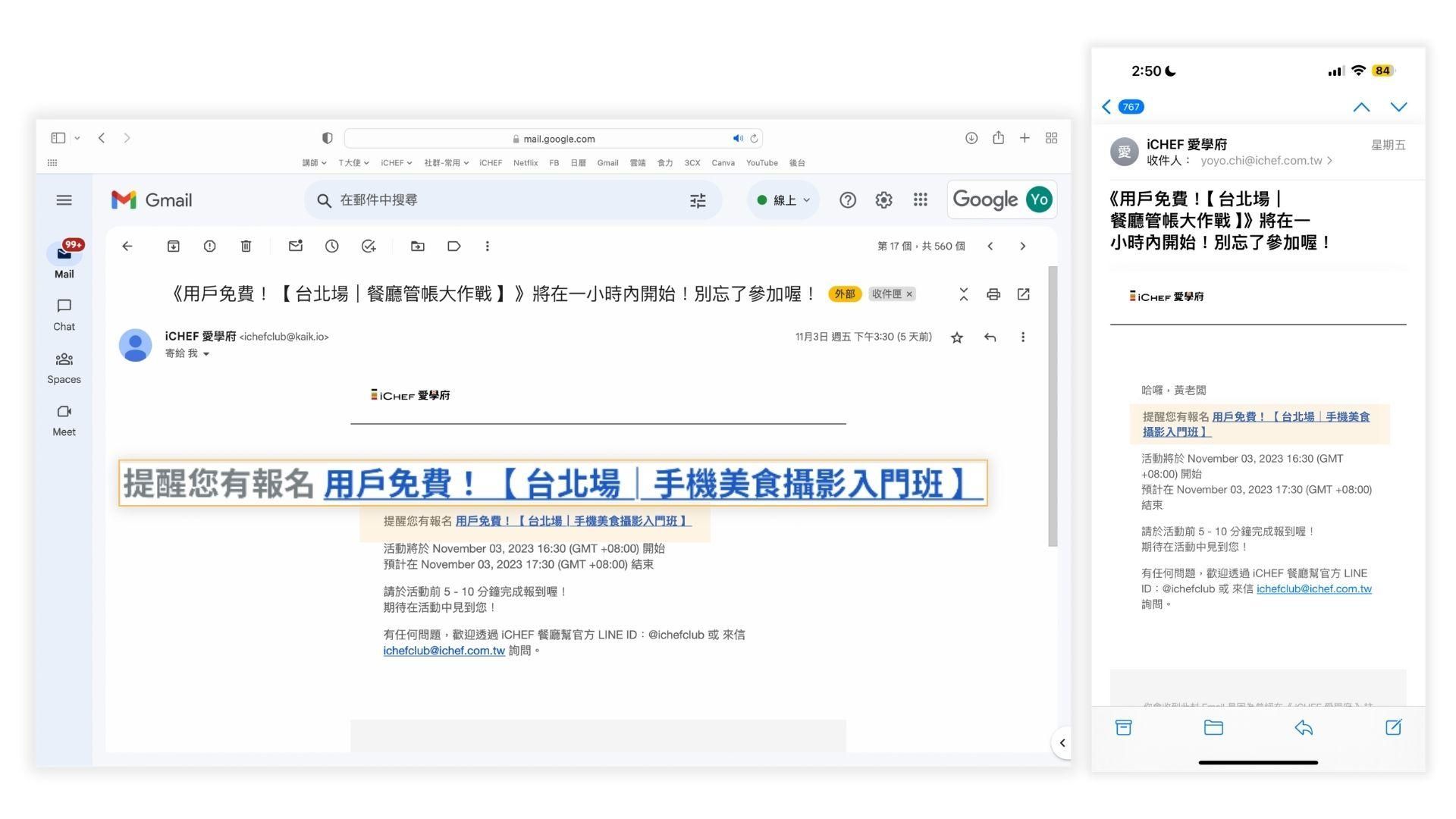 iCHEF 餐廳幫每個月會透過你登記在 iCHEF 後台的信箱,寄送下個月的課程活動資訊,