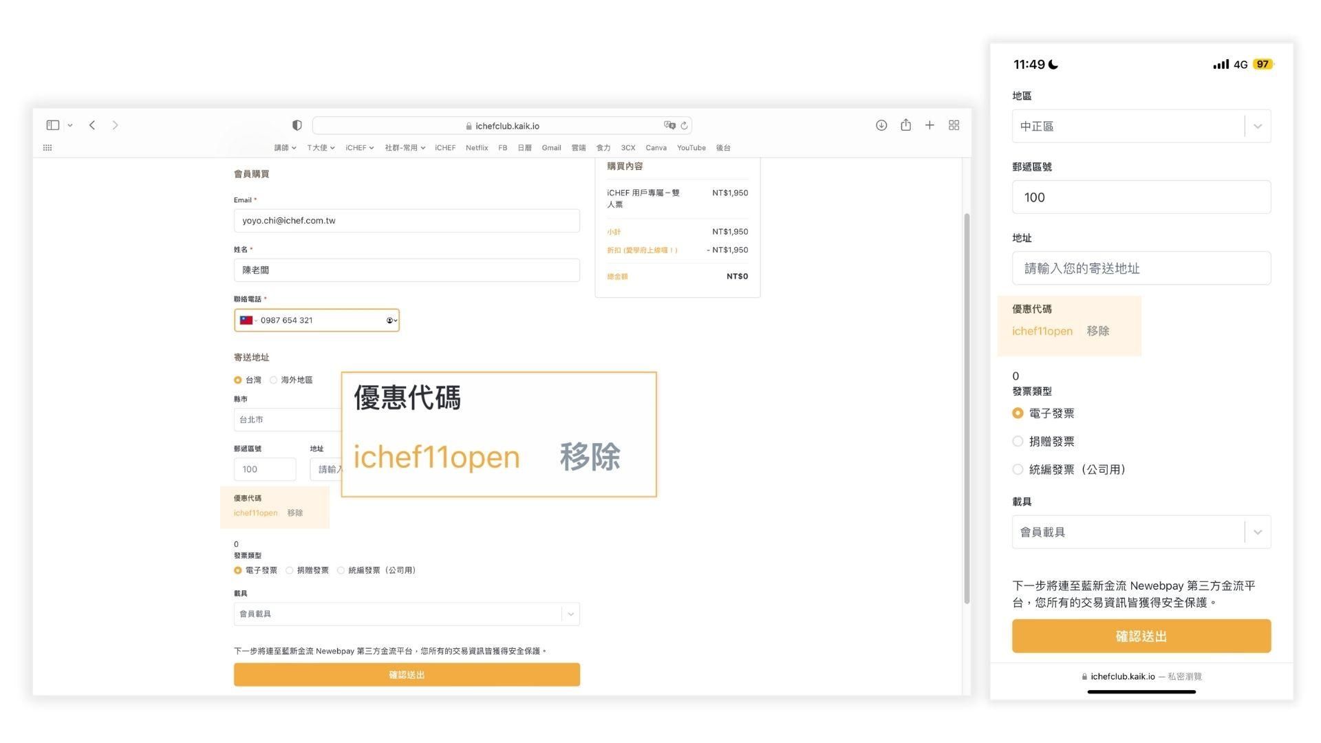 圖 3-5:若你透過 Email 報名,系統會自動帶入 iCHEF 用戶專屬折扣碼,即可免費報名