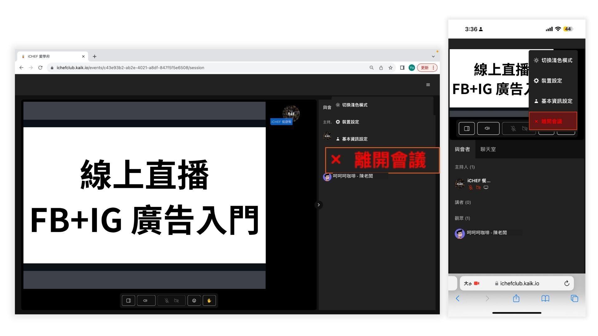 最後當你要退出直播時,你可以點擊右上角三條線處「 離開會議 」如圖 2-11,即可退出直播喔!