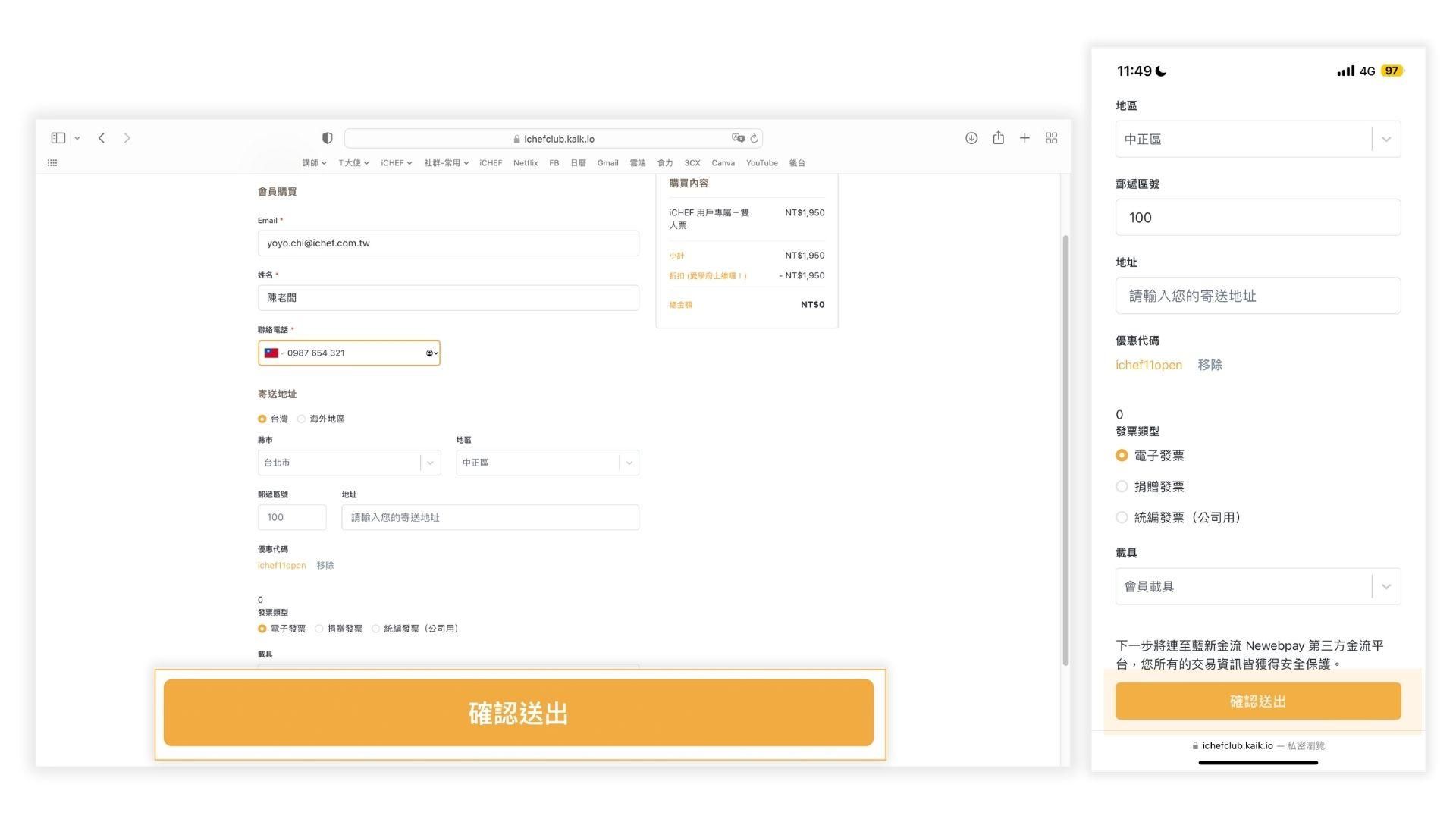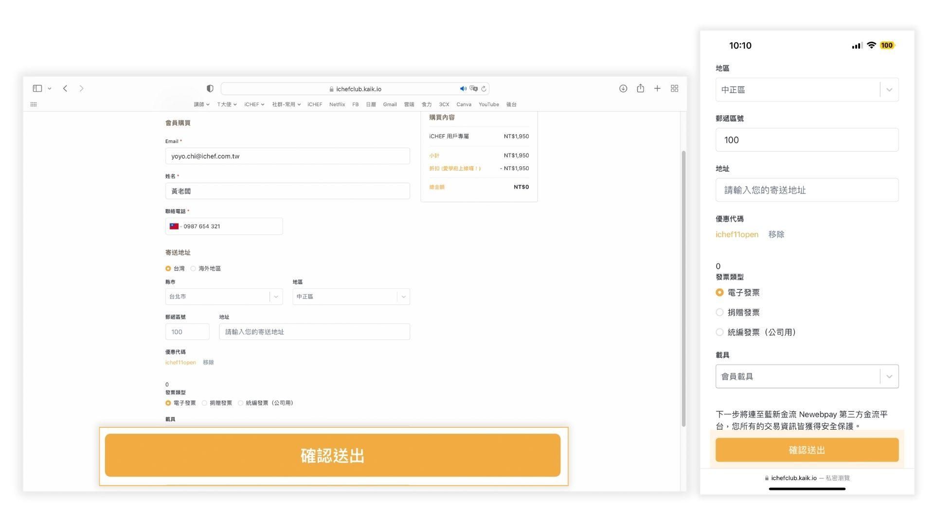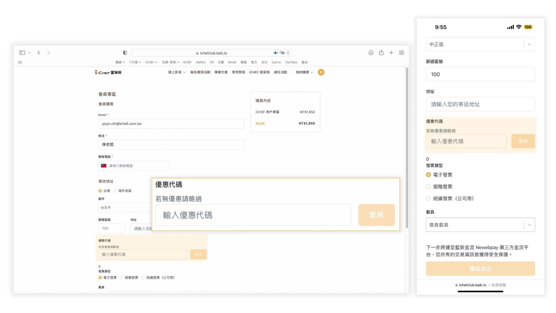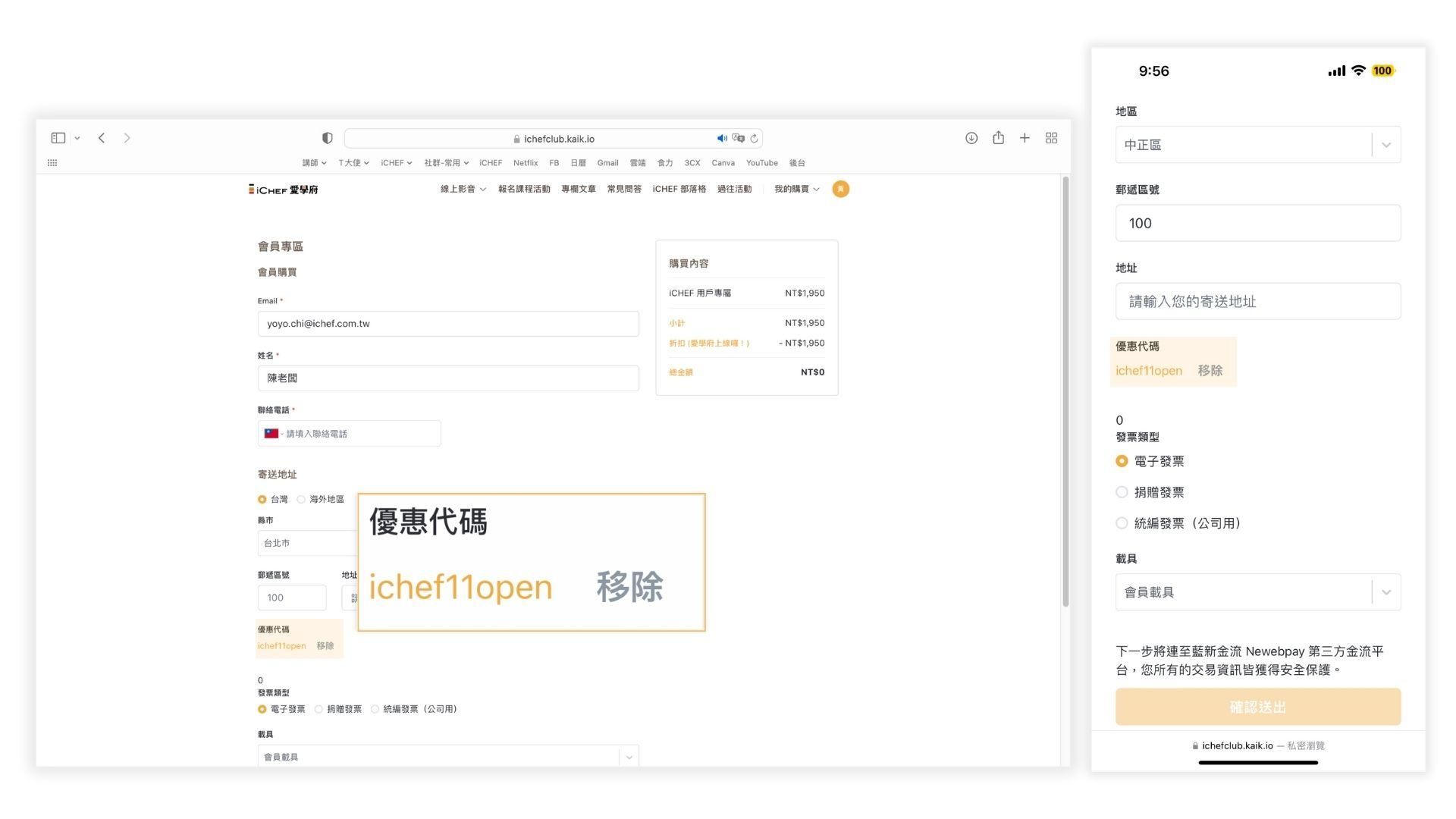 此時請確認個人資料及折扣碼是否正確(若折扣碼無帶入,再請自行輸入折扣碼如圖 3-6))。