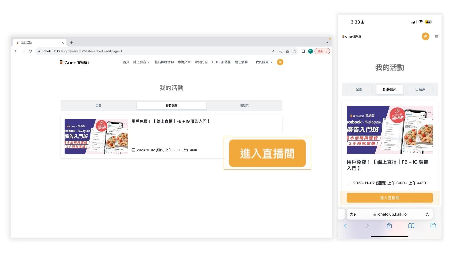 進入【 iCHEF 愛學府 】,透過右上角「 我的購買 」➡️「 我的活動 」,點擊該活動的「 進入直播間 」按鈕即可加入直播間如圖 2-2。