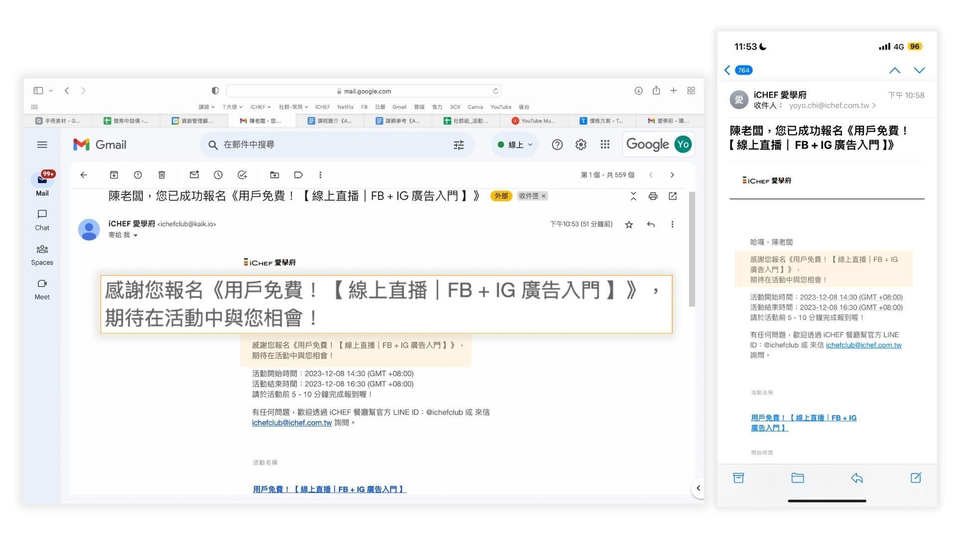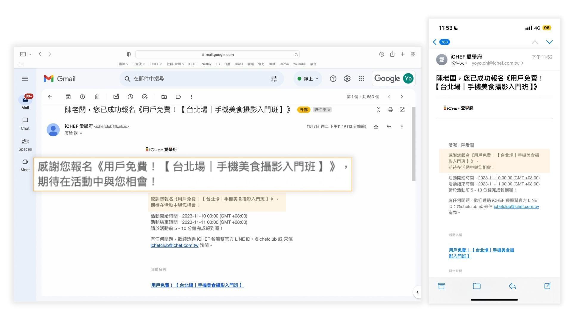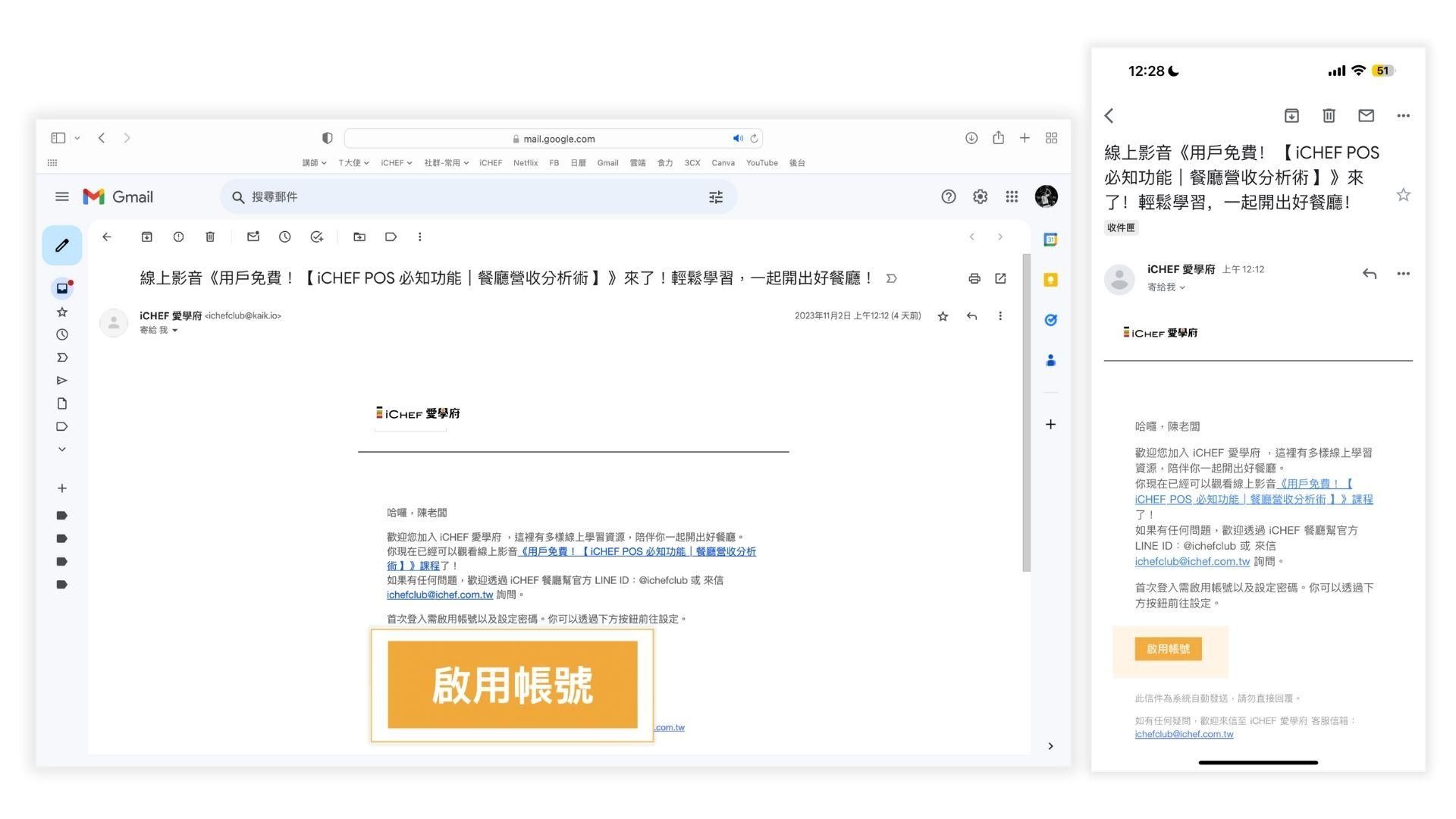 此時若你尚未註冊過【 iCHEF 愛學府 】,你收到的信會如圖 a。