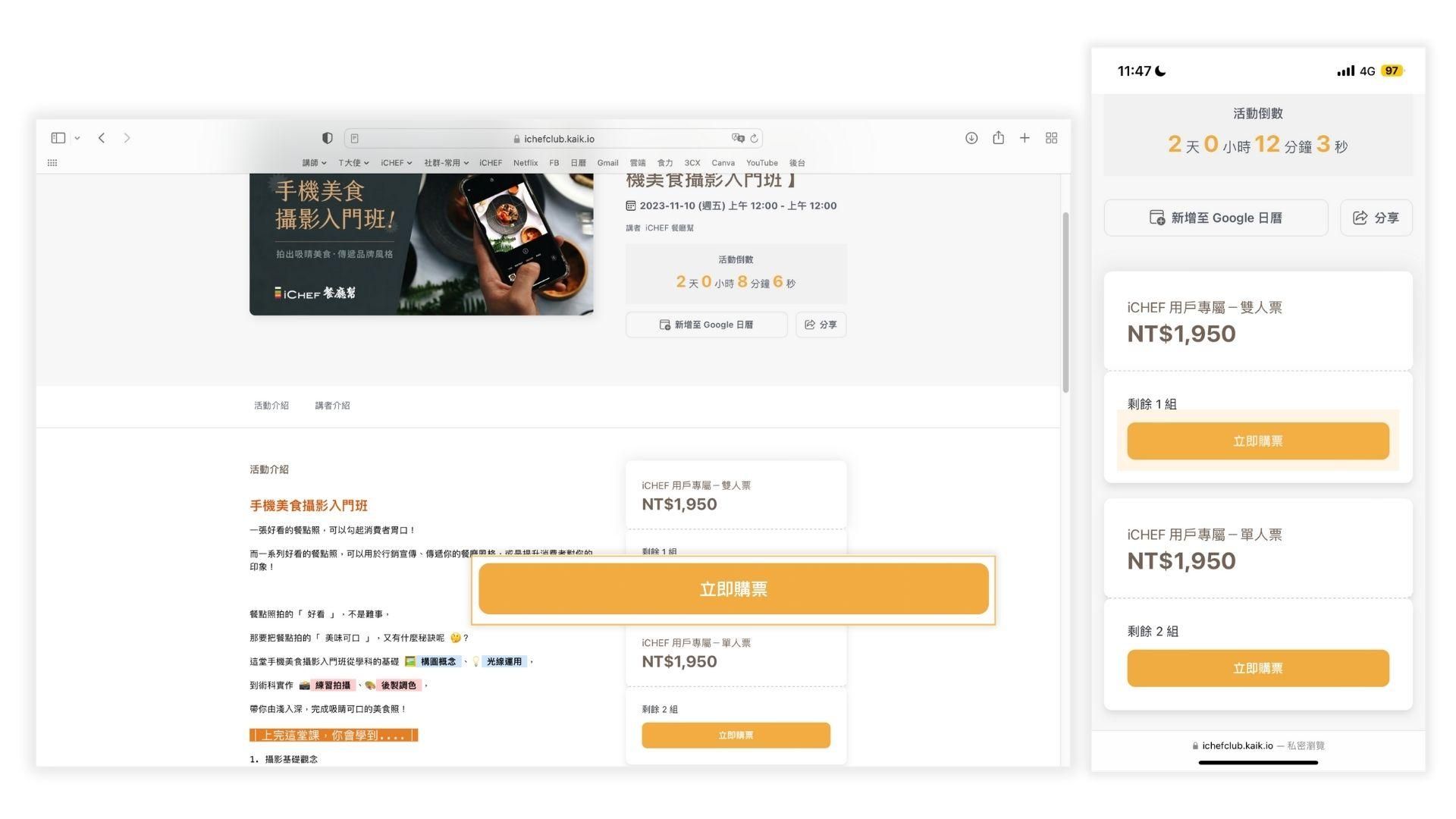 圖 1-5:若你透過 Email 報名,系統會自動帶入 iCHEF 用戶專屬折扣碼,即可免費報名