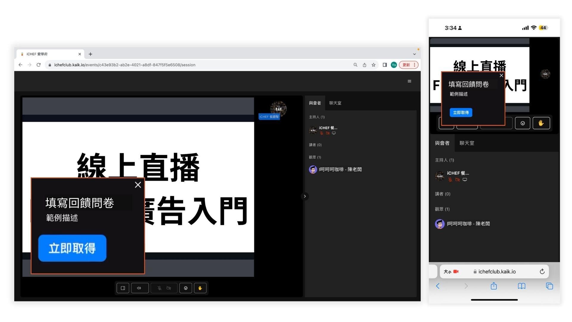 直播尾聲時,別忘了填寫「 回饋問卷 」,點擊左下角方框「 立即取得 」如圖 2-10,你的回饋可以幫助我們規劃後續的課程與活動,也期待你分享你的心得喔!