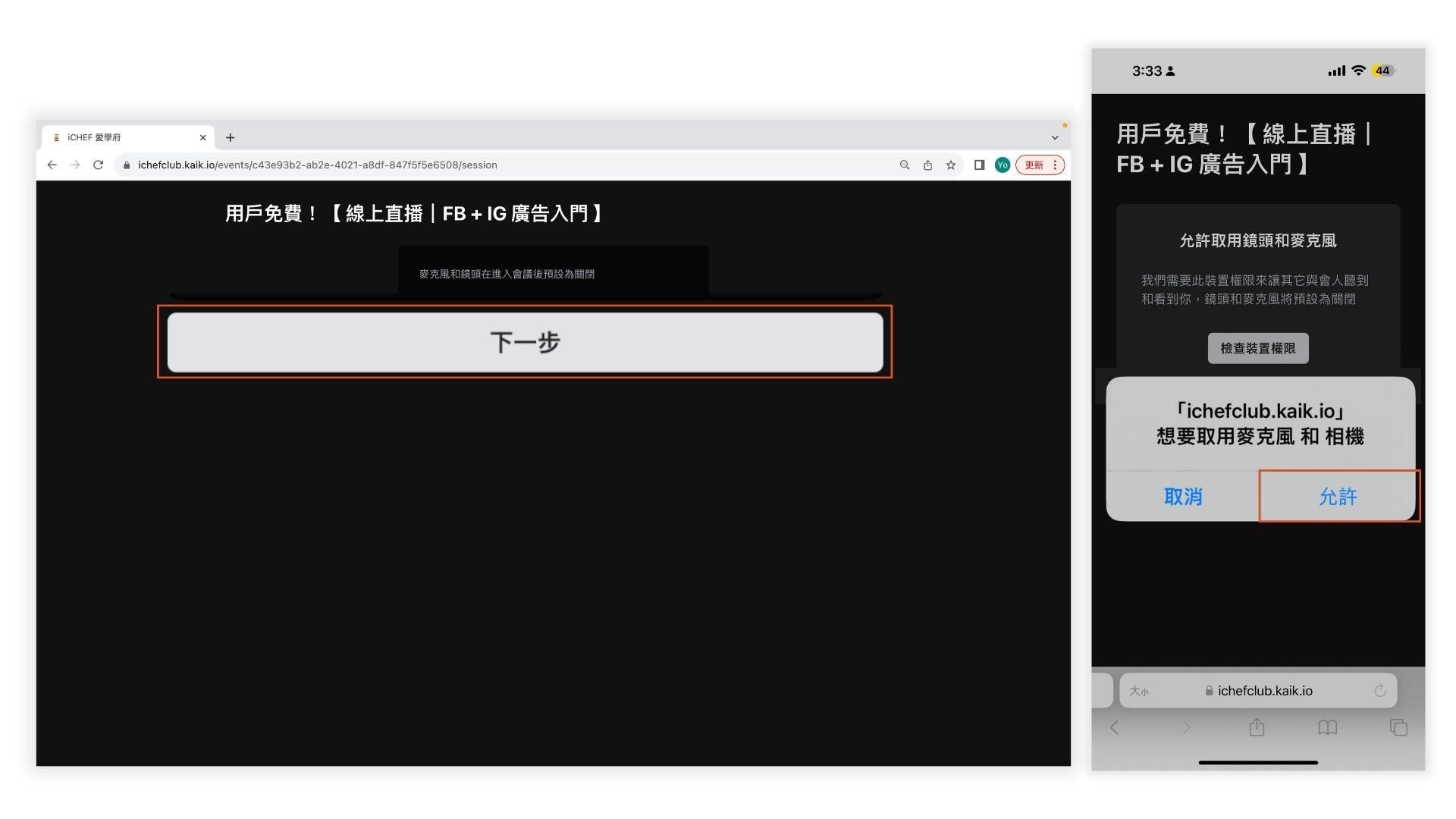 圖 2-3:「 允許 」取用麥克風和相機才能進入直播間